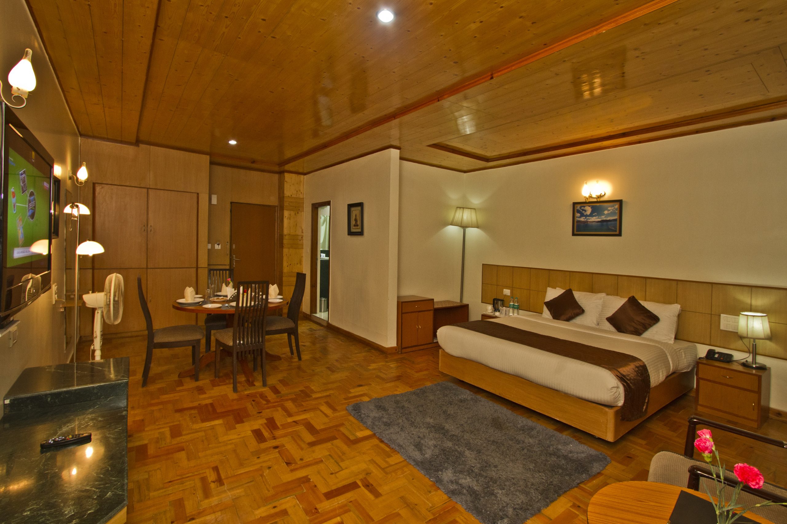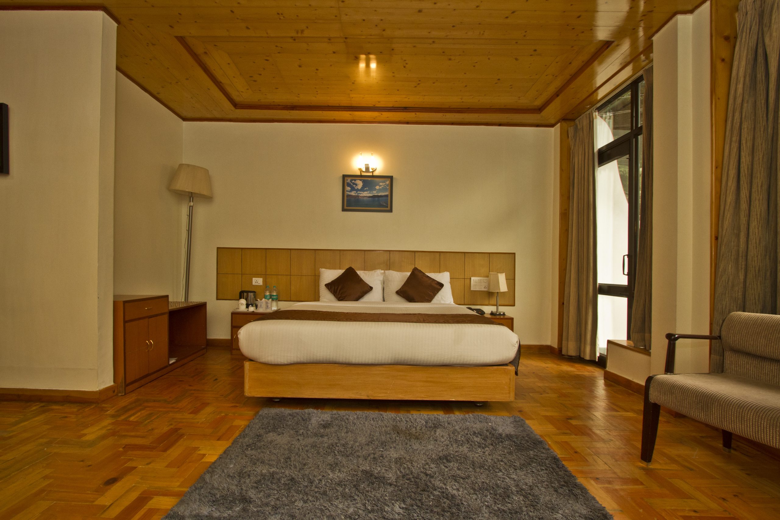 writing desk, sofa chair, cupboard, wooden flooring, choice of twin or king-size double bed etc,
